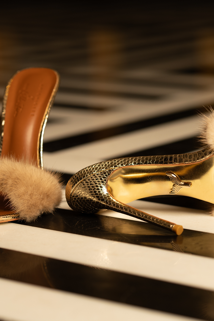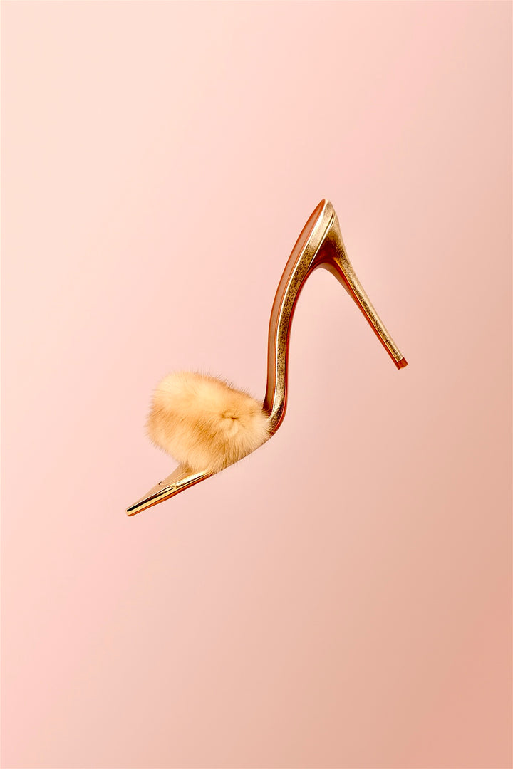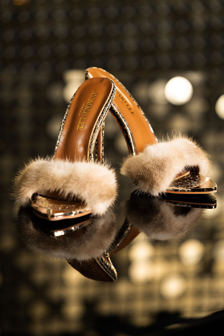 Introducing the Aurielle Mink Heel — a pinnacle of sophistication, crafted for the discerning woman who values elegance and sustainability. With a stunning golden heel that shimmers like liquid sunlight, Aurielle is designed to make every step feel like a statement. Its soft, rich mink accents envelop the foot in unparalleled luxury, providing both texture and warmth with a refined touch.