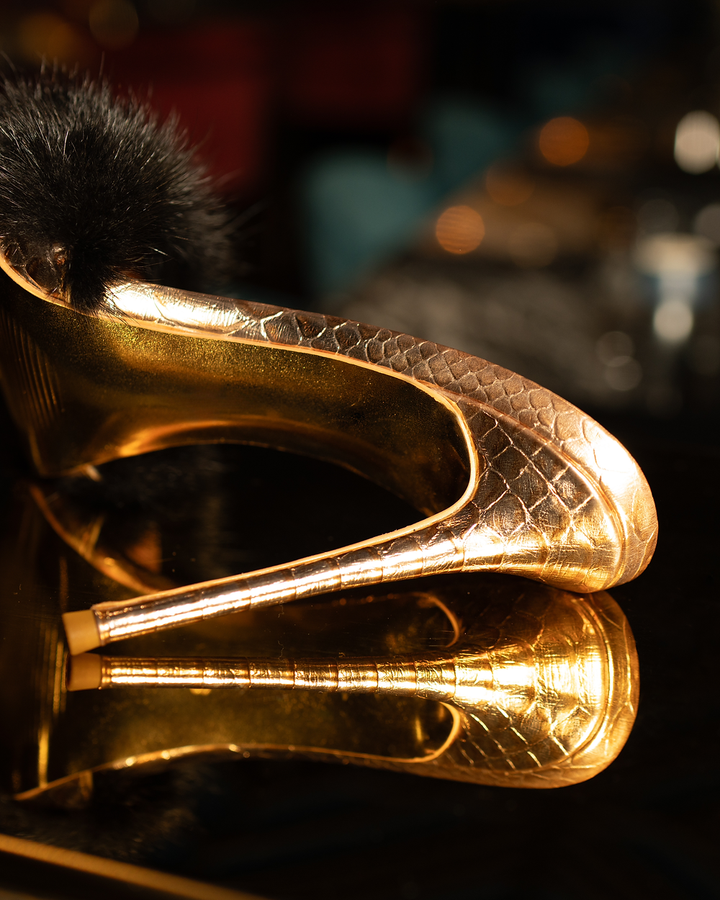 For those who revel in contrasts, Noir Doré is a masterpiece of black and gold with mermaid‑skin accents that lend a subtle, iridescent glow. The gleaming golden heel is elegantly echoed in the rich gold bottom, adding opulence from every angle. Black mink accents, sourced from ten‑year recycled, ethically harvested fur, ground this striking design with depth and texture. Perfect for moments that deserve to be remembered, Noir Doré combines the warmth of gold with the allure of shimmering black for an aura of refined boldness that’s both mindful and mesmerizing.